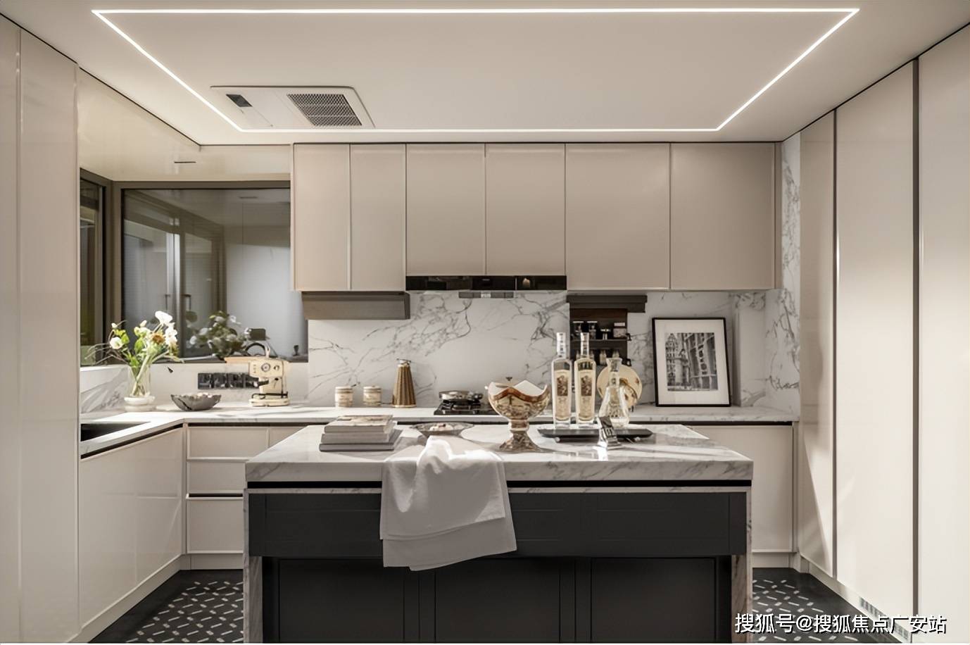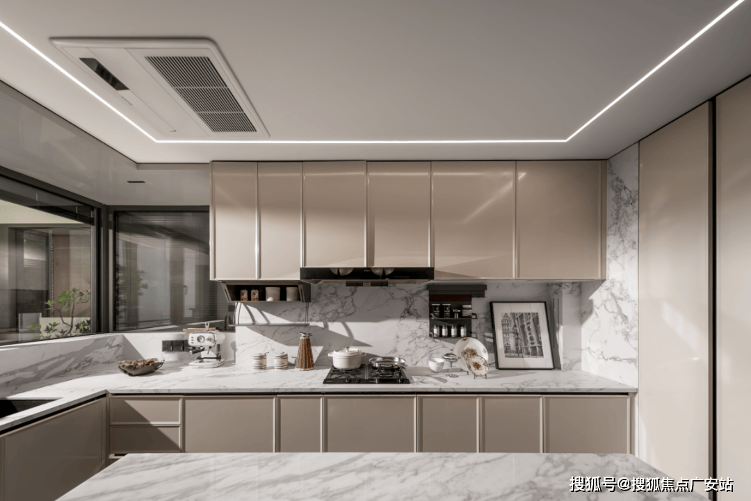 超大尺度的中西岛台,既符合中式烹饪的实用逻辑(预留足够操作台面),又能承载西式社交(朋友小聚时在岛台品酒聊天),让厨房从“单一做饭空间”变成“生活场景发生器”。